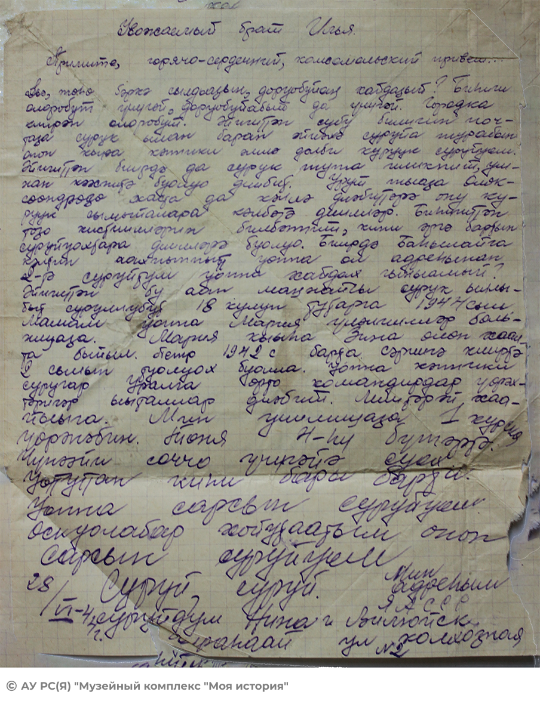 Дьэ, төһө бэркэ сылдьаҕын, доруобуйаҥ хайдаҕый? Биһиги олоробут үчүгэй, доруобуйабыт да үчүгэй. Городка киирэн олоробут. Эйигиттэн субу билигин почтаҕа сурук ылан баран эйиэхэ суруйа турабын онон кыра кэнниеи эмиэ дэлби куруук суруйуом. Эйигиттэн биирдэ да сурук тута иликпит , умнан кээспитэ буолуо диибит. Урут тыаҕа Өлөксөөндрөҕө хаста да кэллэ диэбиттэрэ ону куруук сымыйалара кэлбэтэ дииллэр. Биһигиттэн тоҕо кистииллэрин билбэппит, кини эргэ бартын суруйуохтара дииллэрэ буолуо. Биирдэ Баһылайга кэлтин аахпыппыт уонна ол адреһынан 2-р суруйтум уонна хайдах гыныамый?