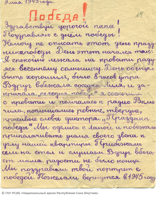 Я спокойно лежала на кровати радуясь весеннему солнышку. День обещал быть хорошим, было 8 часов утра. Вдруг вбежала соседка Лиля, и закричала «сегодня победа» я соскочила с кровати и помчалась к радио. Включила, послышались ровные, твердые, красивые слова диктора «Праздник победы». Мы оделись с Ланой и побежали приколачивать знамя своего звена к углу нашей квартиры. Прибежали сели на стол и слушаем. Вдруг вбегает мама радости не было конца. Мы поздравили твой портрет с победой. Пожелали вернуться в 1945 году.