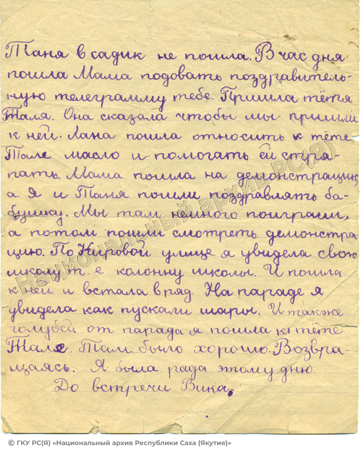 Таня в садик не пошла. В час дня пошла мама подавать поздравительную телеграмму тебе. Пришла тетя Таля. Она сказала, чтобы мы пришли к ней. Лана пошла относить к тете Тале масло и помогать ей стряпать. Мама пошла на демонстрацию, а я и Таня пошли поздравлять бабушку. Мы там немного поиграли, а потом пошли смотреть демонстрацию. По Кировой улице я увидела свою школу т.е. колонну школы. И пошла к ней и встала в ряд. На параде я увидела как пускали шары, и также голубей от парада я пошла к тете Тале. Там было хорошо. Возвращаясь я была рада этому дню.